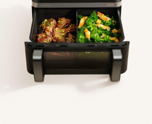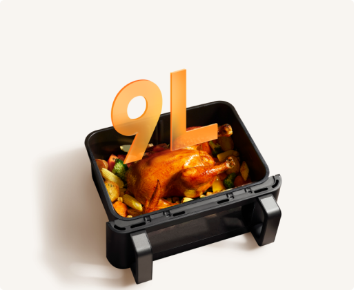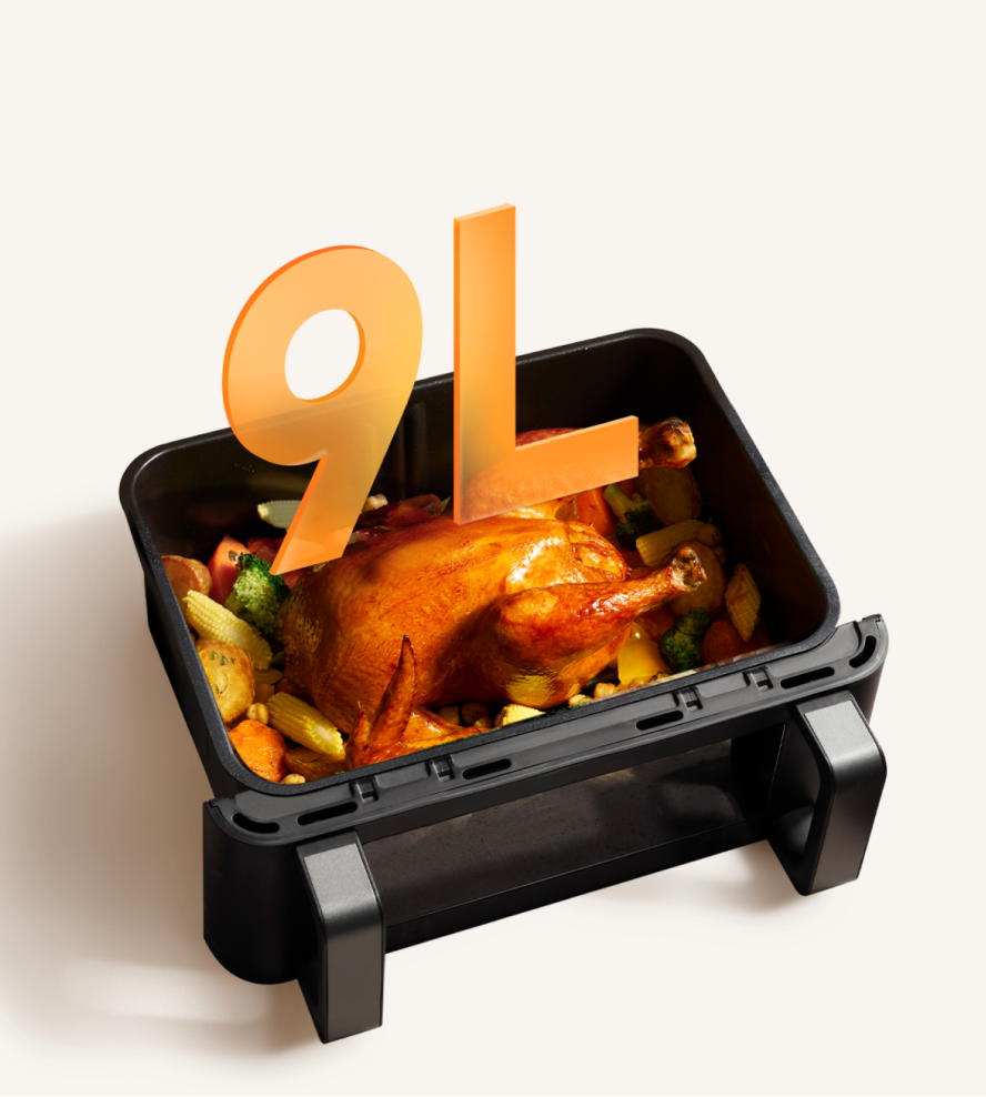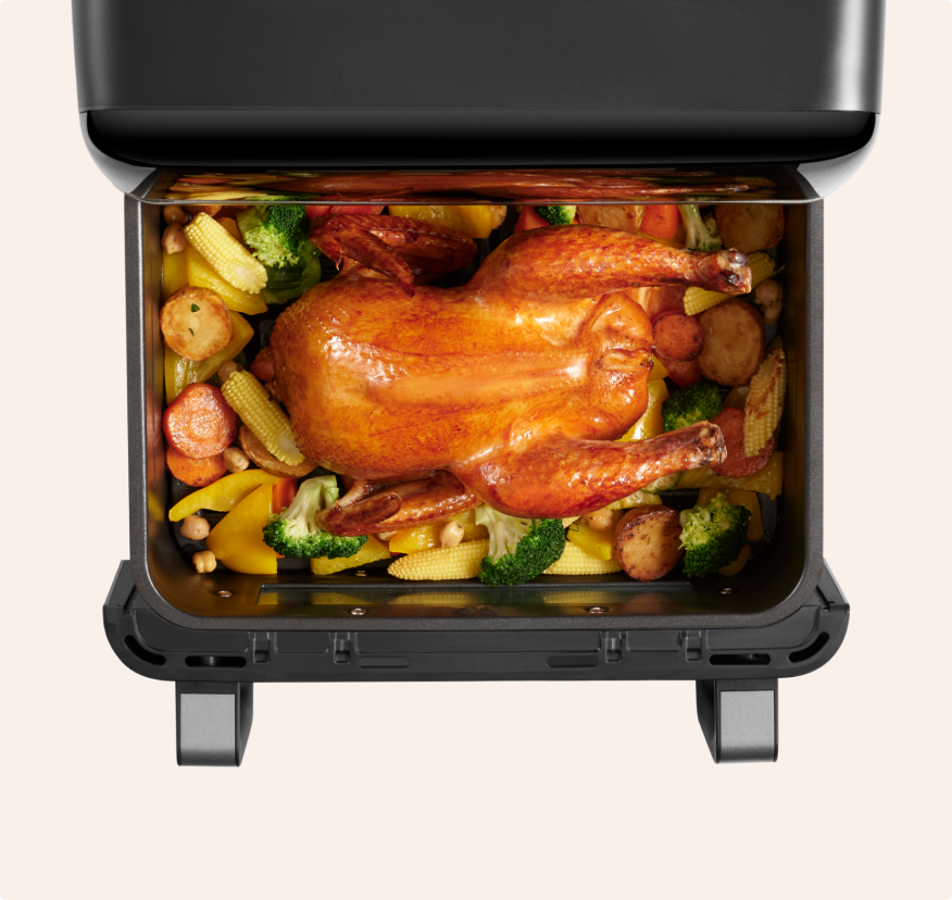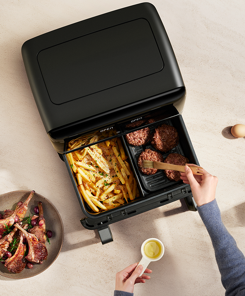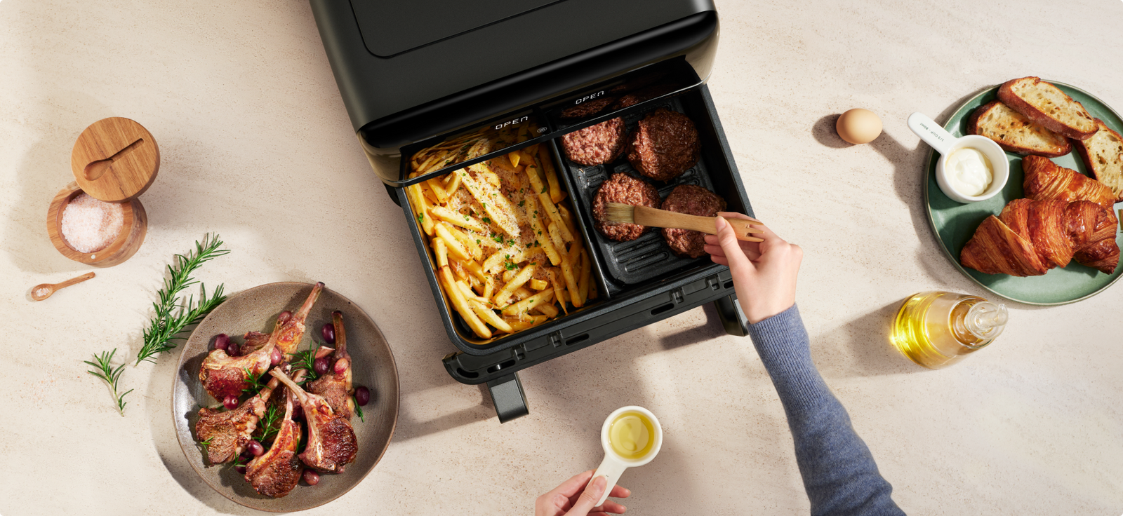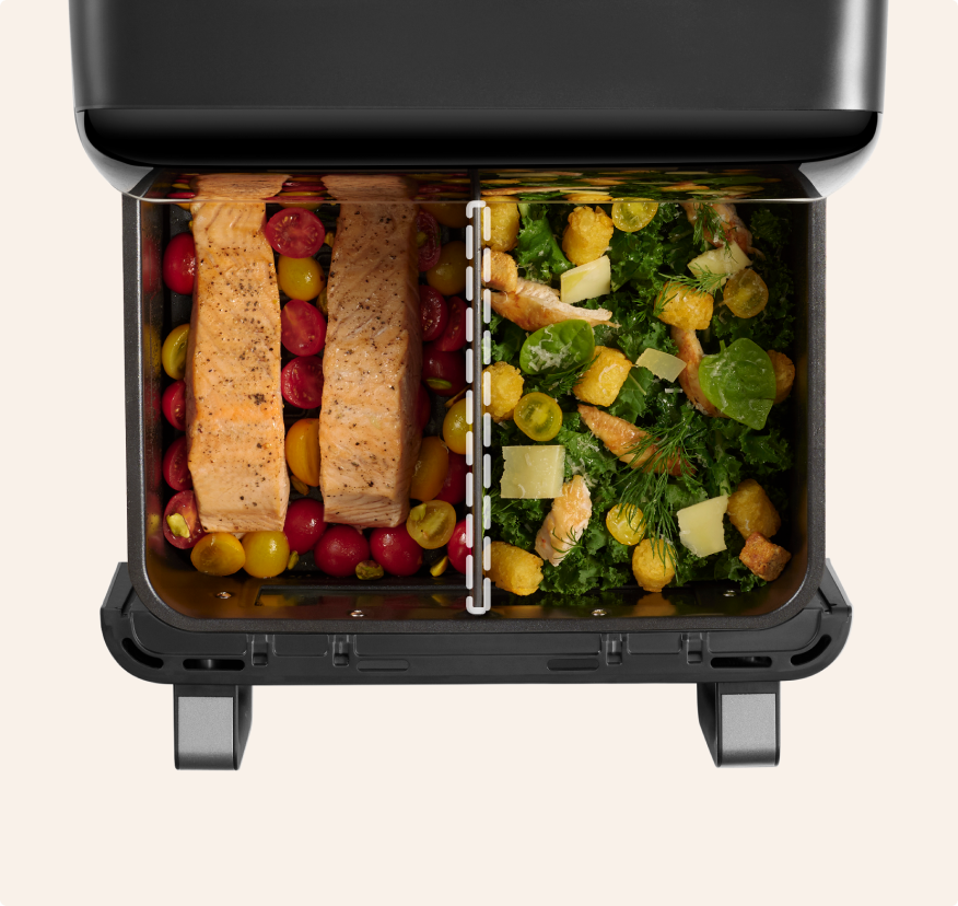 Onze FlexZone™-mand kan eenvoudig worden omgeschakeld van een ruime megazone van 9 liter naar 2 aparte kookzones, zonder dat de smaken tussen de gerechten overlopen.