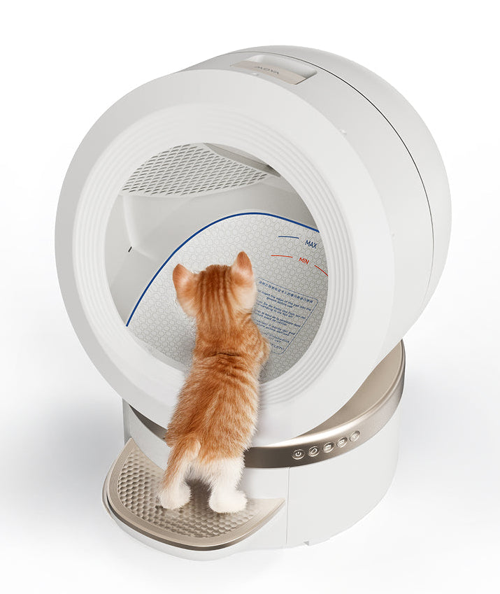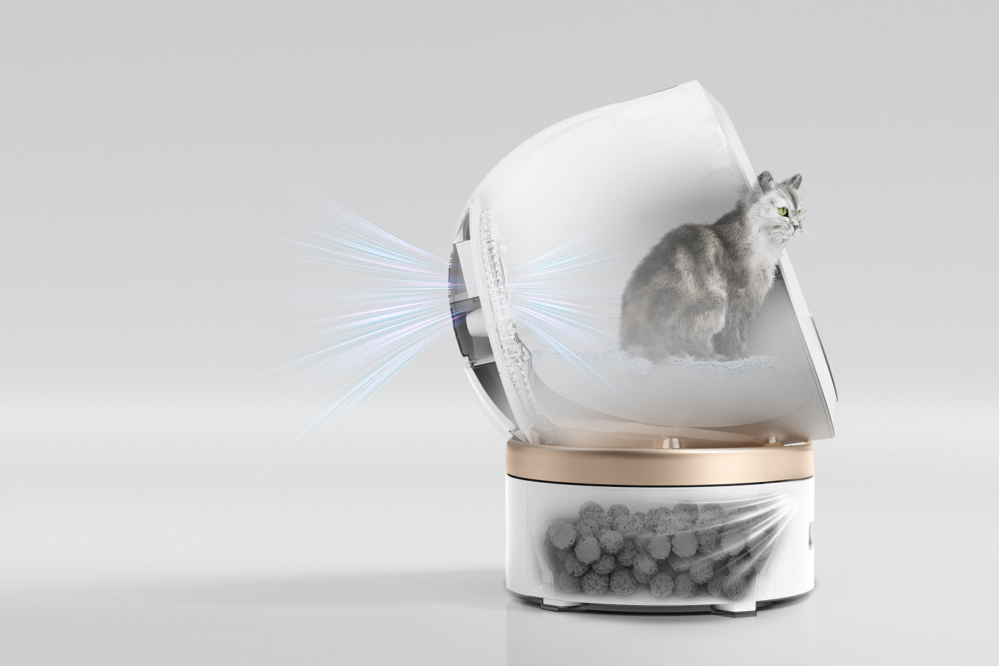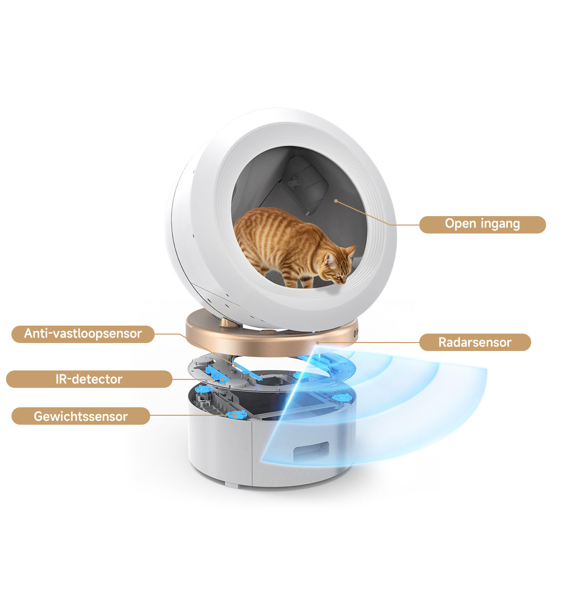 Dankzij de handgreep aan de bovenkant kunt u hem er met één simpele beweging uit tillen. De plastic balvormige bak en kattenbak kunnen in enkele seconden worden afgespoeld en daarna snel weer op hun plaats worden geklikt, zonder dat uw handen in contact komen met de uitwerpselen.