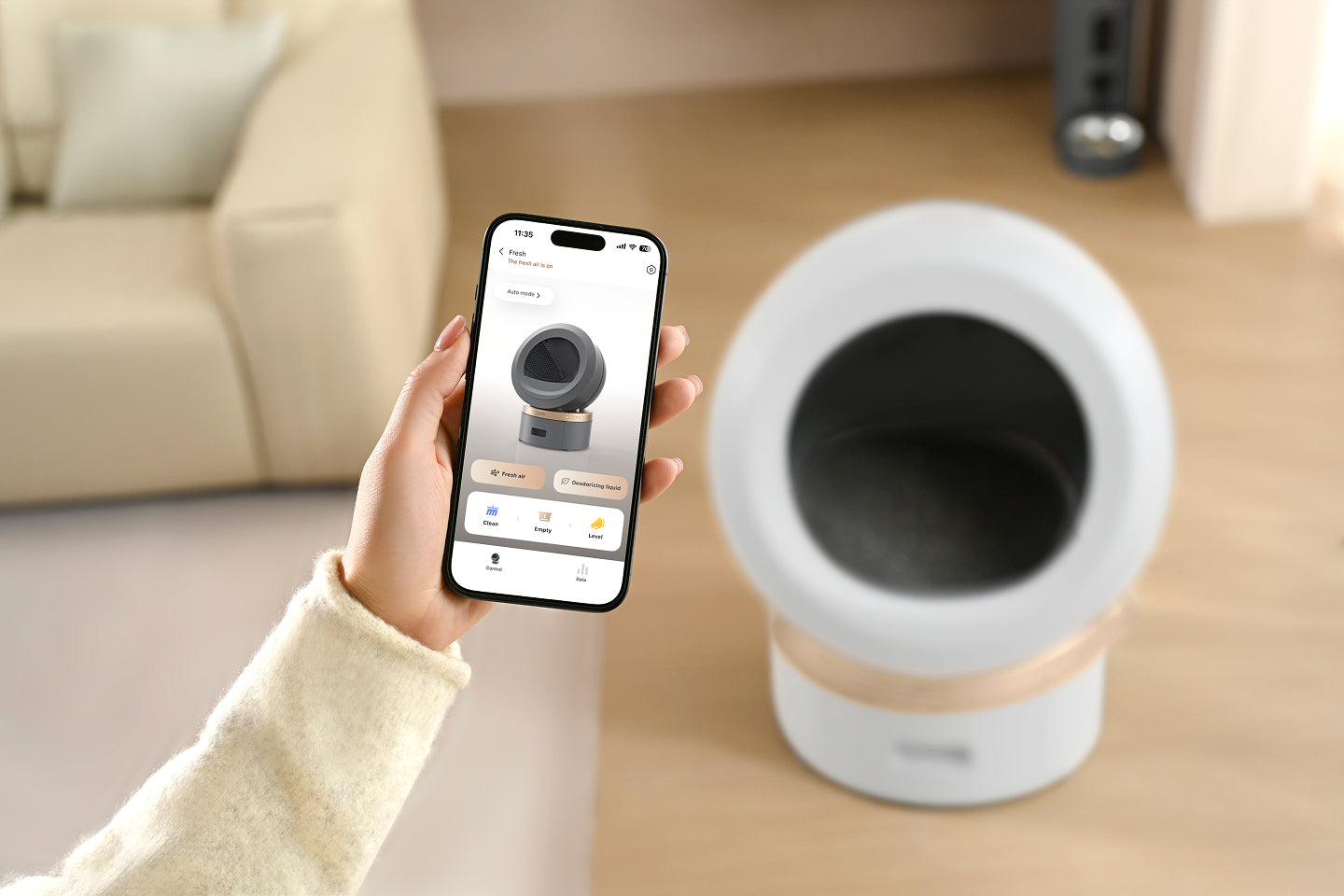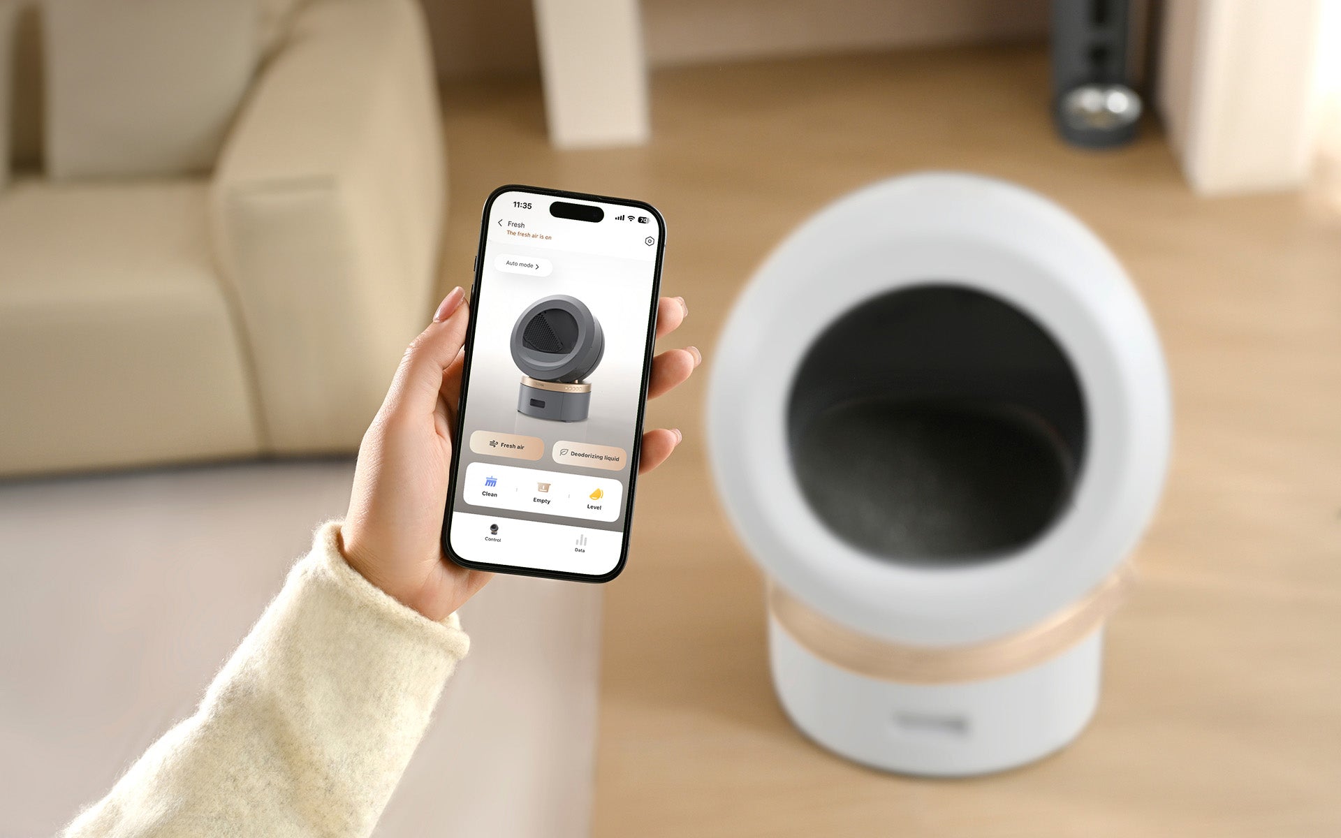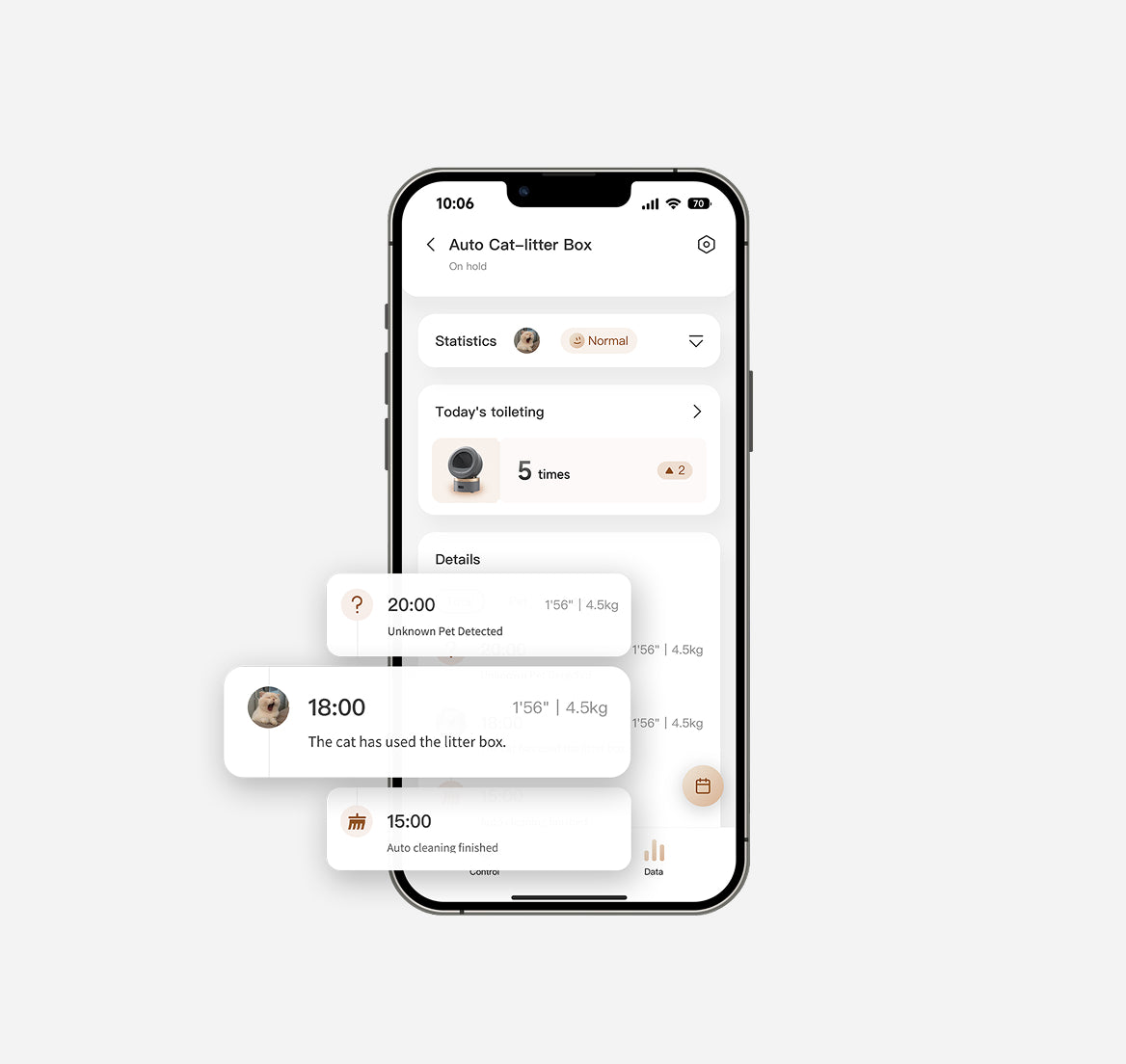 Biedt een allesomvattend gezondheidsecosysteem voor uw kat. Ontlastingsgegevens worden door slimme algoritmen geanalyseerd om de gezondheid te bewaken en om voedingsplannen automatisch op het MOVA-voederstation voor huisdieren PF20 Pro aan te passen.