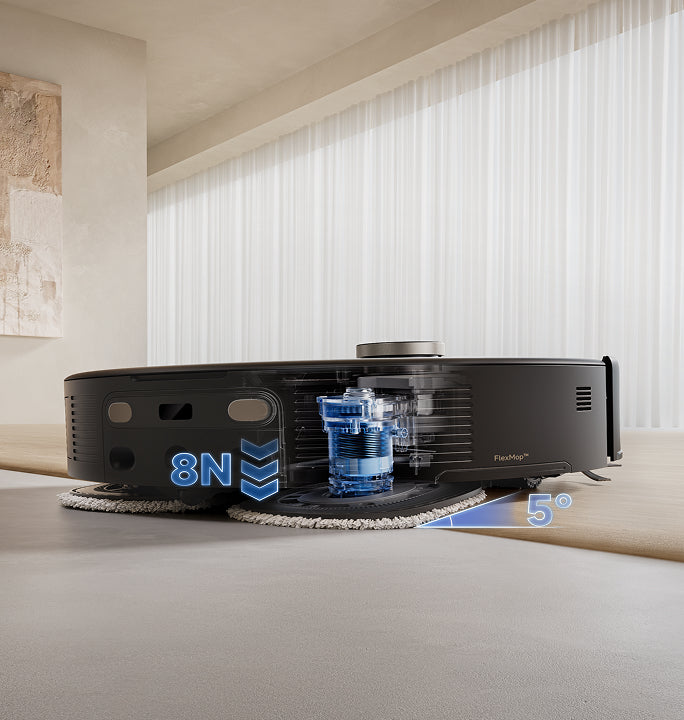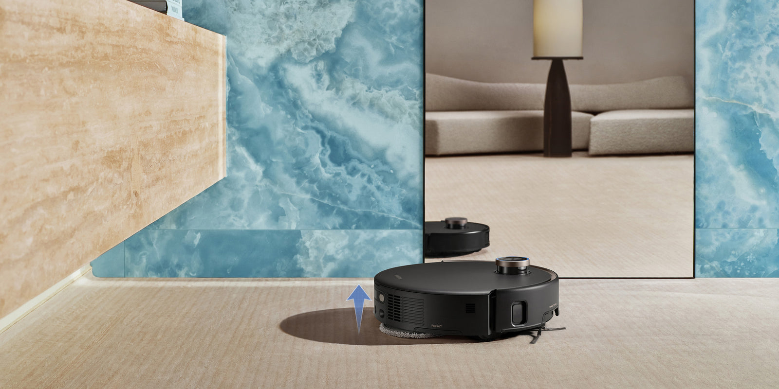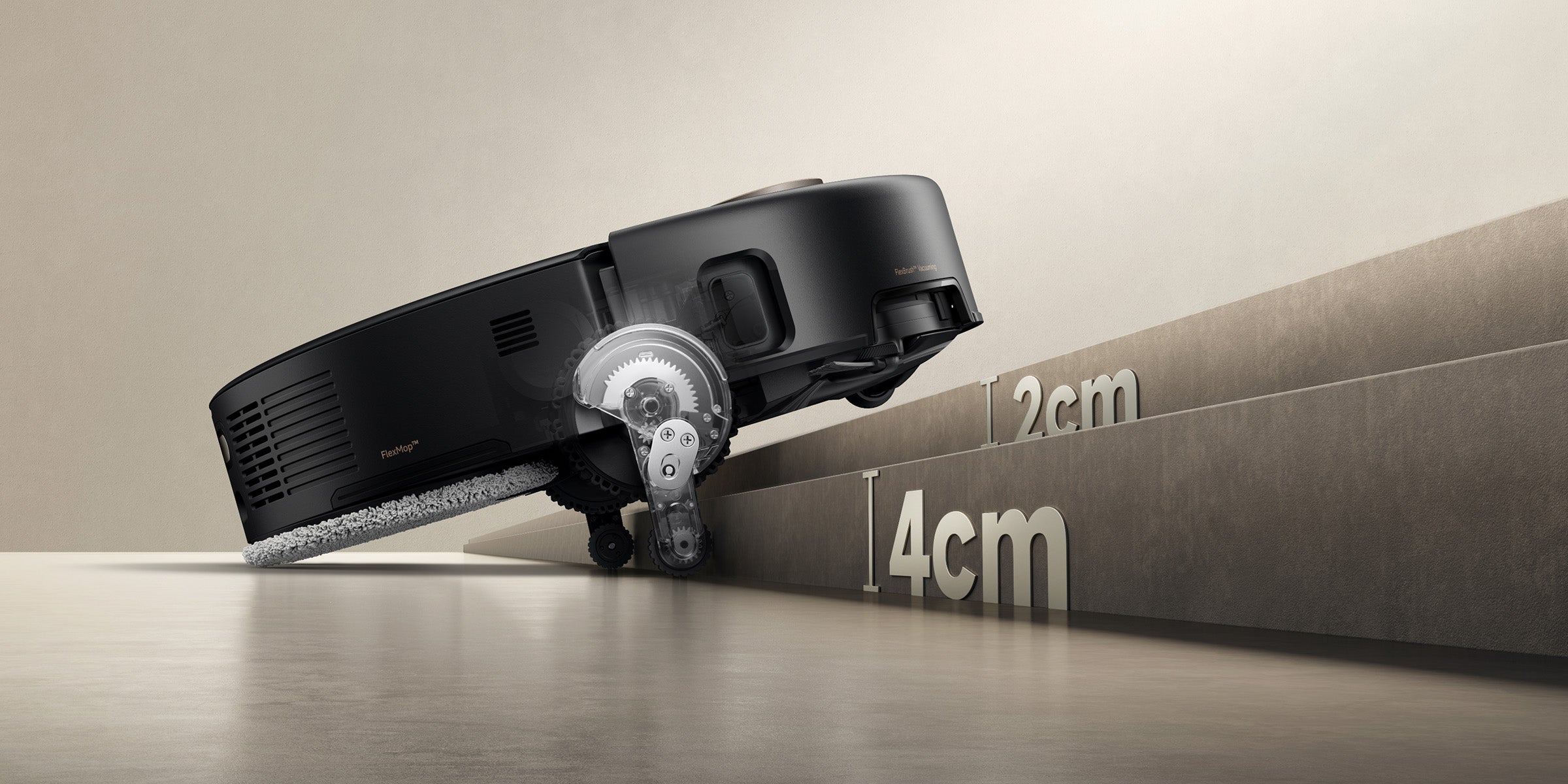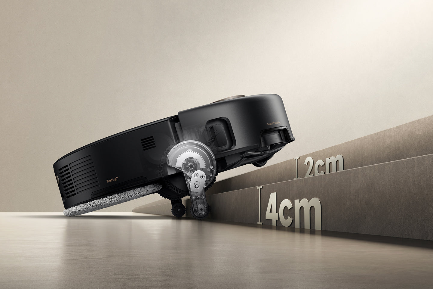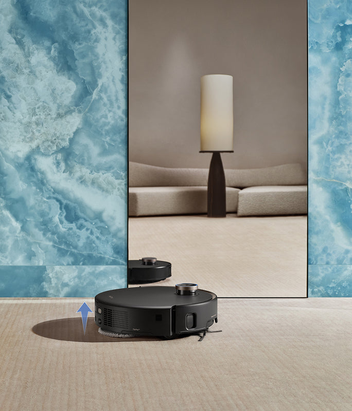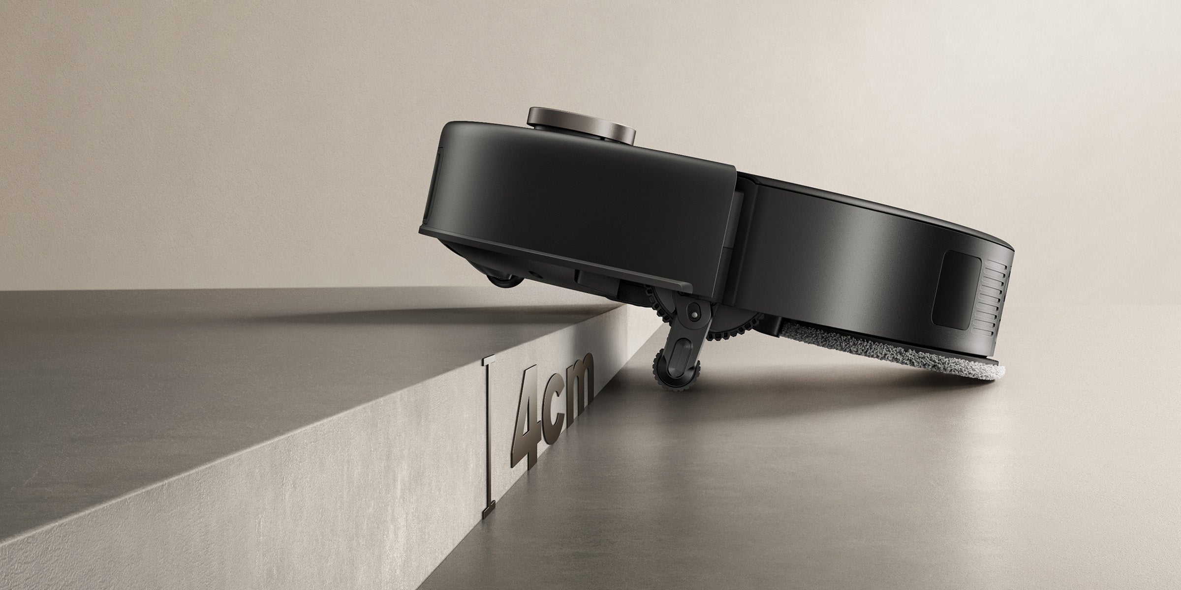 StepMaster™ System features robotic retractable legs that can lift the chassis, allowing it to easily cross over steps, thresholds, door tracks, U-shaped furniture legs, and small obstacles up to 6cm* high. It navigates complex home environments with ease for thorough cleaning and effortless return.